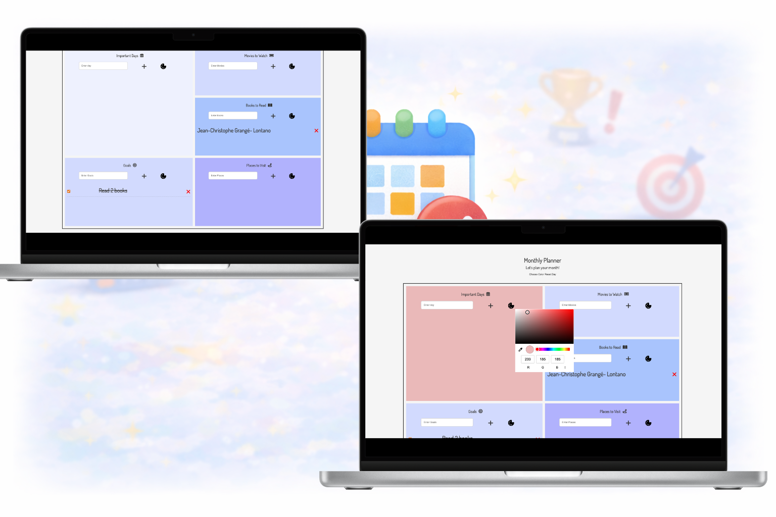 Monthly Planner is an interactive web application designed to help users organize monthly activities, goals, and important events. The app includes five structured sections for tracking movies, books, travel plans, personal goals, and important days. Users can also customize section colors to personalize their experience. This was my first JavaScript project, focused on core concepts such as DOM manipulation, event handling, and localStorage-based CRUD operations — building a strong foundation for creating dynamic web apps without frameworks.